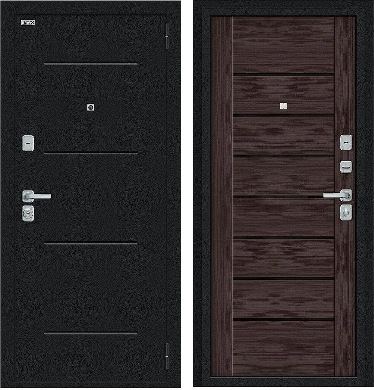 Надежная входная Дверь Браво Техно/BChrome Букле черное/Wenge Melinga премиум класса по цене 34 639 руб. Большая толщина стали защитит от проникновения в ваш дом, квартиру или коттедж. Используется очень качественная фурнитура: замки, цилиндры, ручки, защелки. Покрытие и отделка двери изготовлено под внимательным контролем производителя. Дверь имеет долгий срок службы и гарантию.