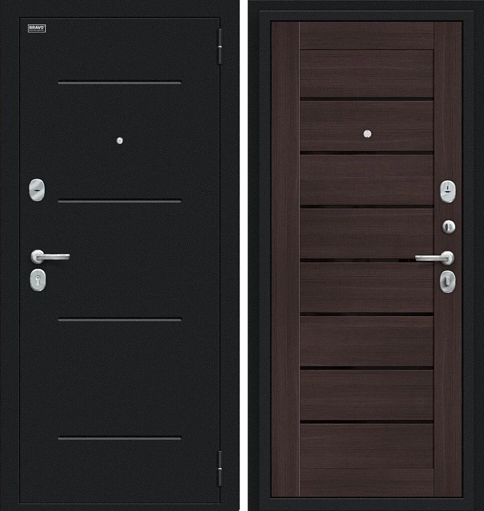Надежная входная Дверь Браво Техно Букле черное/Wenge Veralinga премиум класса по цене 30 989 руб. Большая толщина стали защитит от проникновения в ваш дом, квартиру или коттедж. Используется очень качественная фурнитура: замки, цилиндры, ручки, защелки. Покрытие и отделка двери изготовлено под внимательным контролем производителя. Дверь имеет долгий срок службы и гарантию.